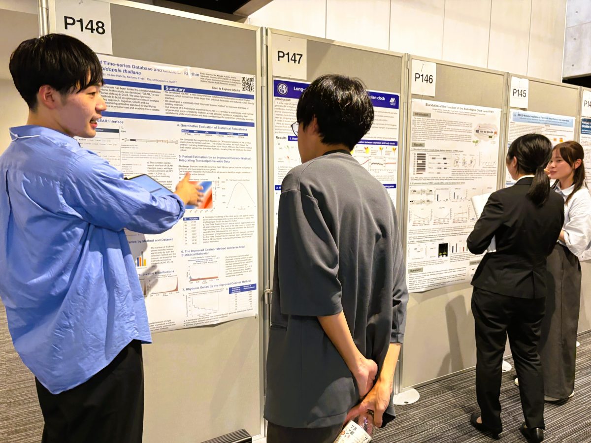 伊藤さん(M2)、衣川さん(M2)、澤田さん(M2)、西田さん(M2)が学会発表を行いました。News2025.10.15当研究室の伊藤さん(M2)、衣川さん(M2)、澤田さん(M2)、西田さん(M2)が、京都市で開催された日本時間生物学会第32回年会に参加し、ポスター発表を行いました。さらに、衣川さんは若手コロキウムでの口頭発表も行い、懇親会への無料招待権を獲得しました。今回は沢山の研究室メンバーも応援に駆け付け、賑やかな学会参加となりました。