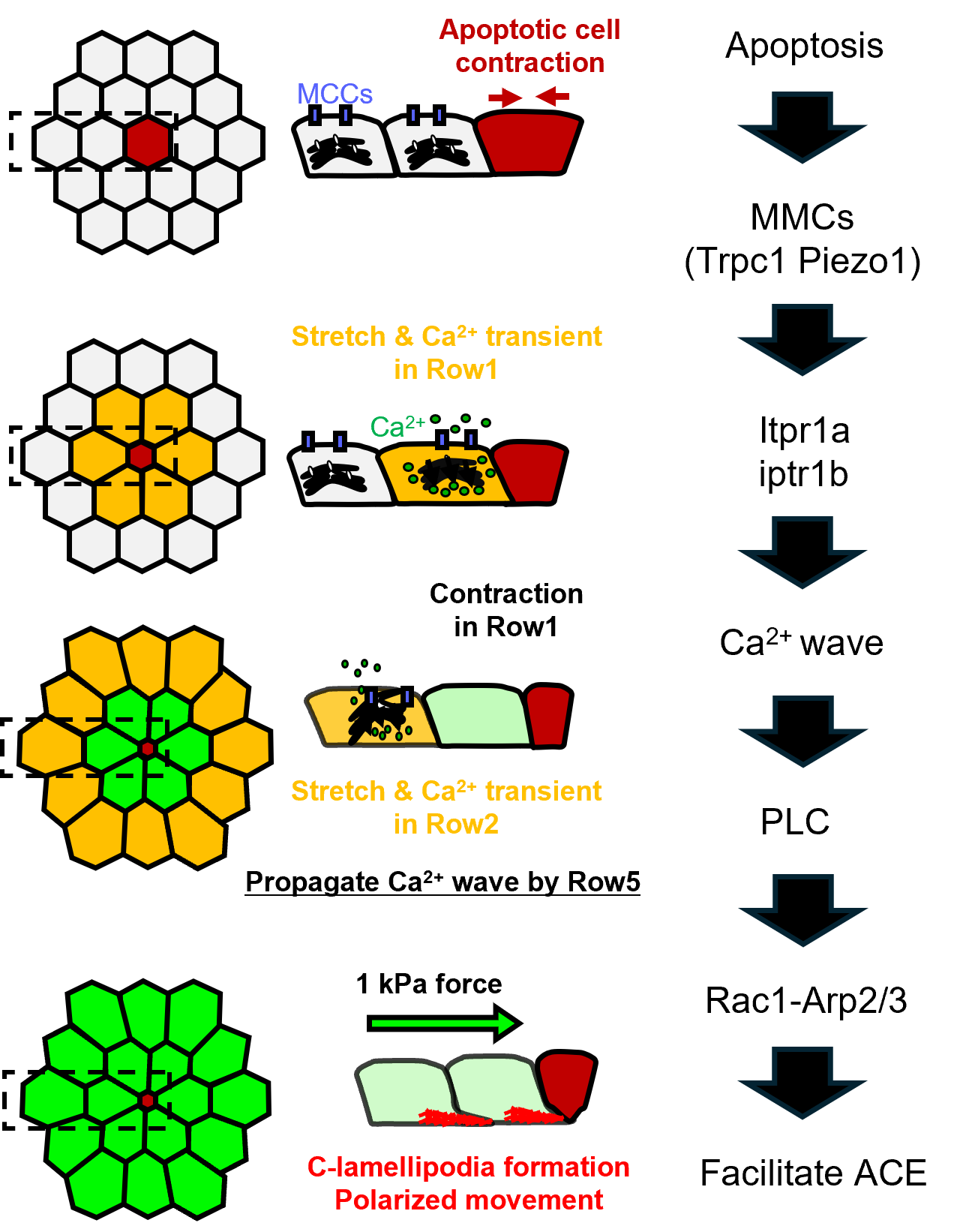 In epithelial tissues that cover the surface of our body, damaged cells are removed through a programmed cell death process known as apoptosis, thereby maintaining tissue integrity. The process in which apoptotic cells are extruded from the tissue is called apoptotic cell extrusion (ACE). In this study, the team elucidated that during ACE, a calcium wave—a transient increase in intracellular Ca²⁺ concentration—propagates among neighboring cells and coordinates their collective movements to expel dying cells.