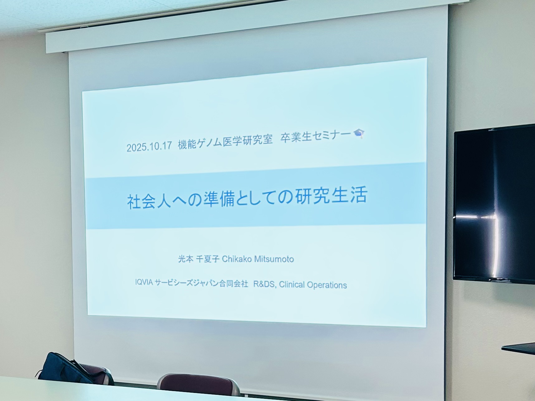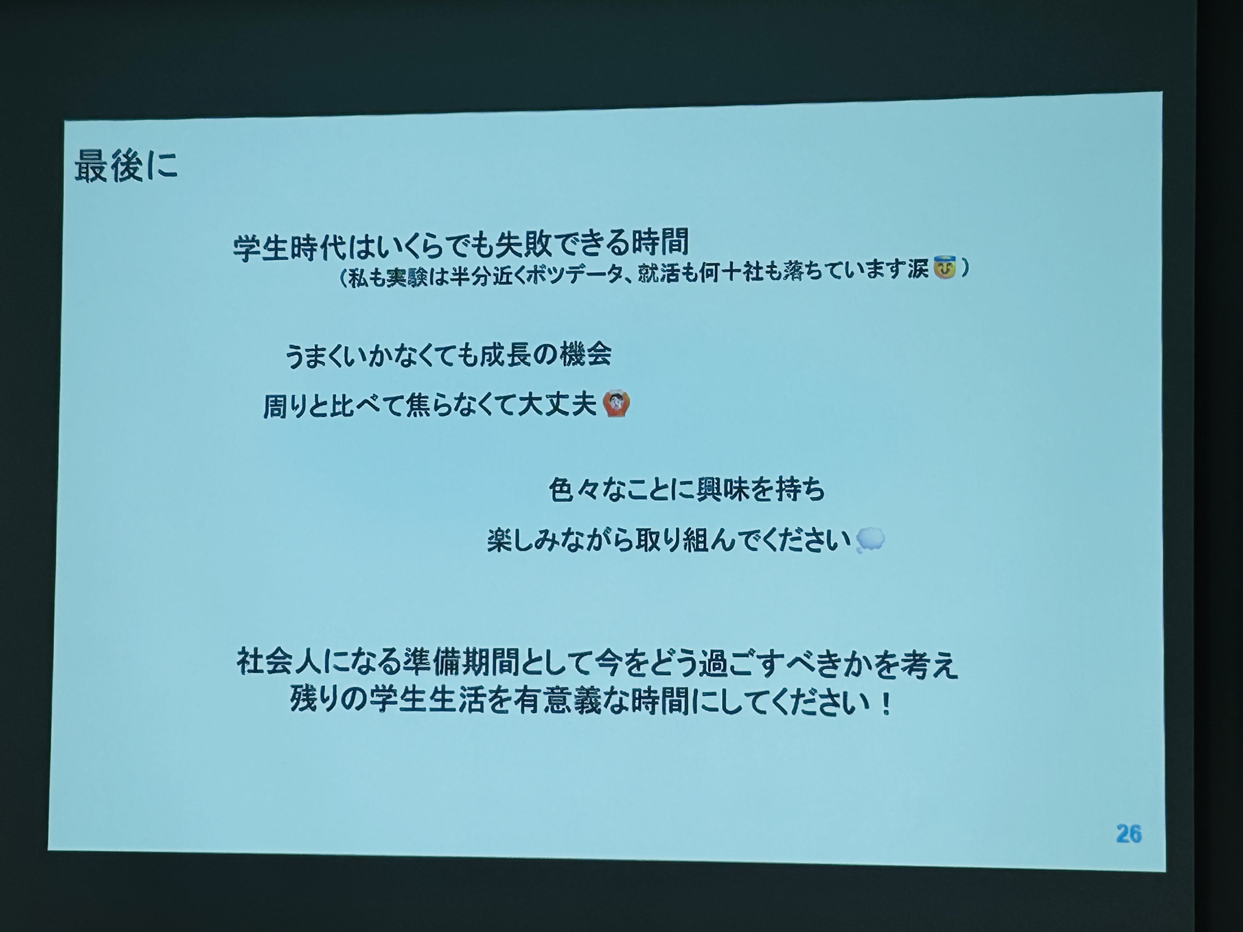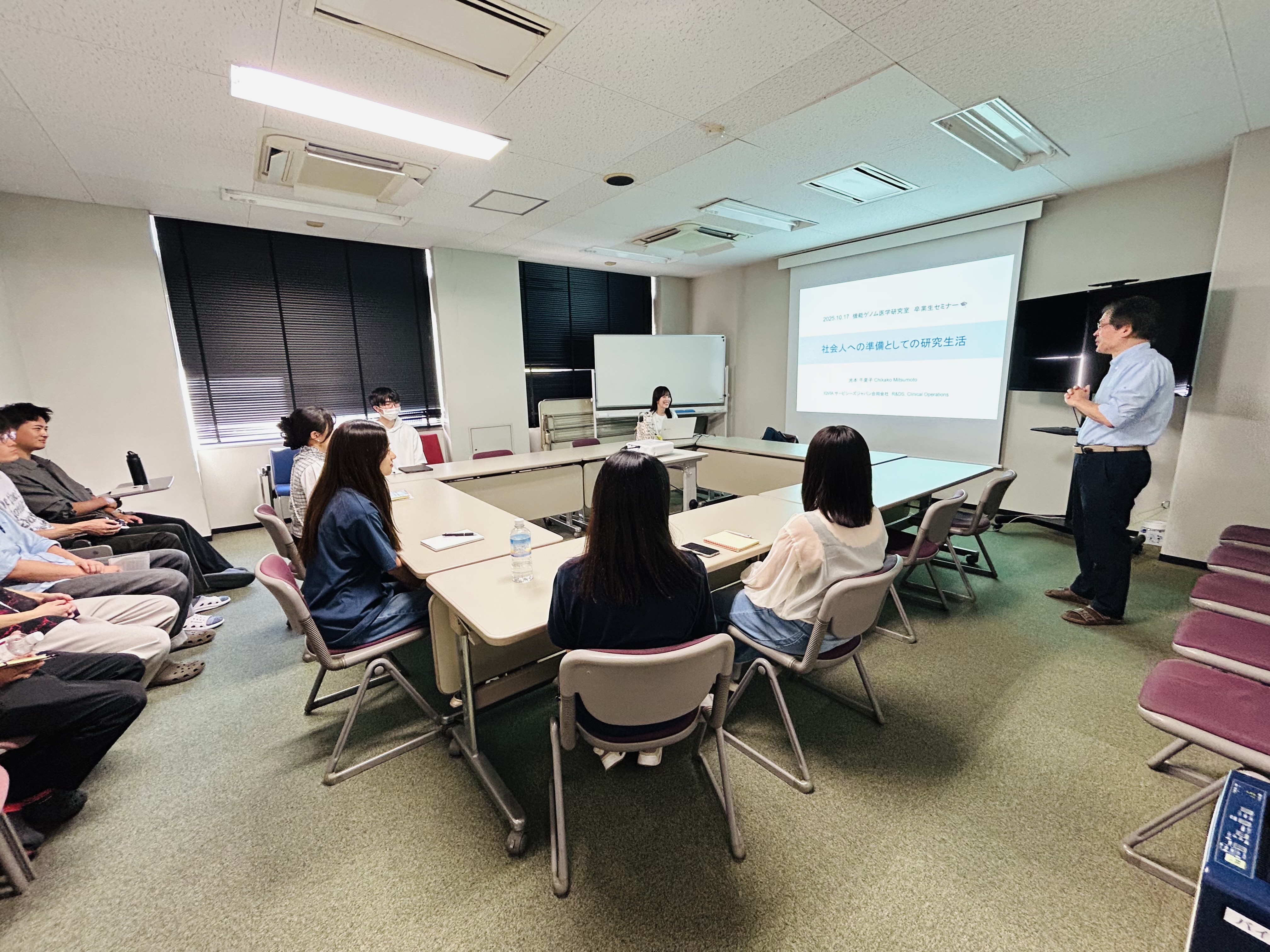 「究極のところ、研究室での研究においても、会社に入ってからの仕事においても、先輩や上司から教わったことをそのまま何も考えずに追従するのではなくて、なぜそうなるのか、なぜそのように考えるのか、とことん突き詰めて自分の頭で考える、という軸は共通していると思います」と、セミナーの最後に後輩たちに向けて、強く訴えていました。心に残る素晴らしいセミナーでした。