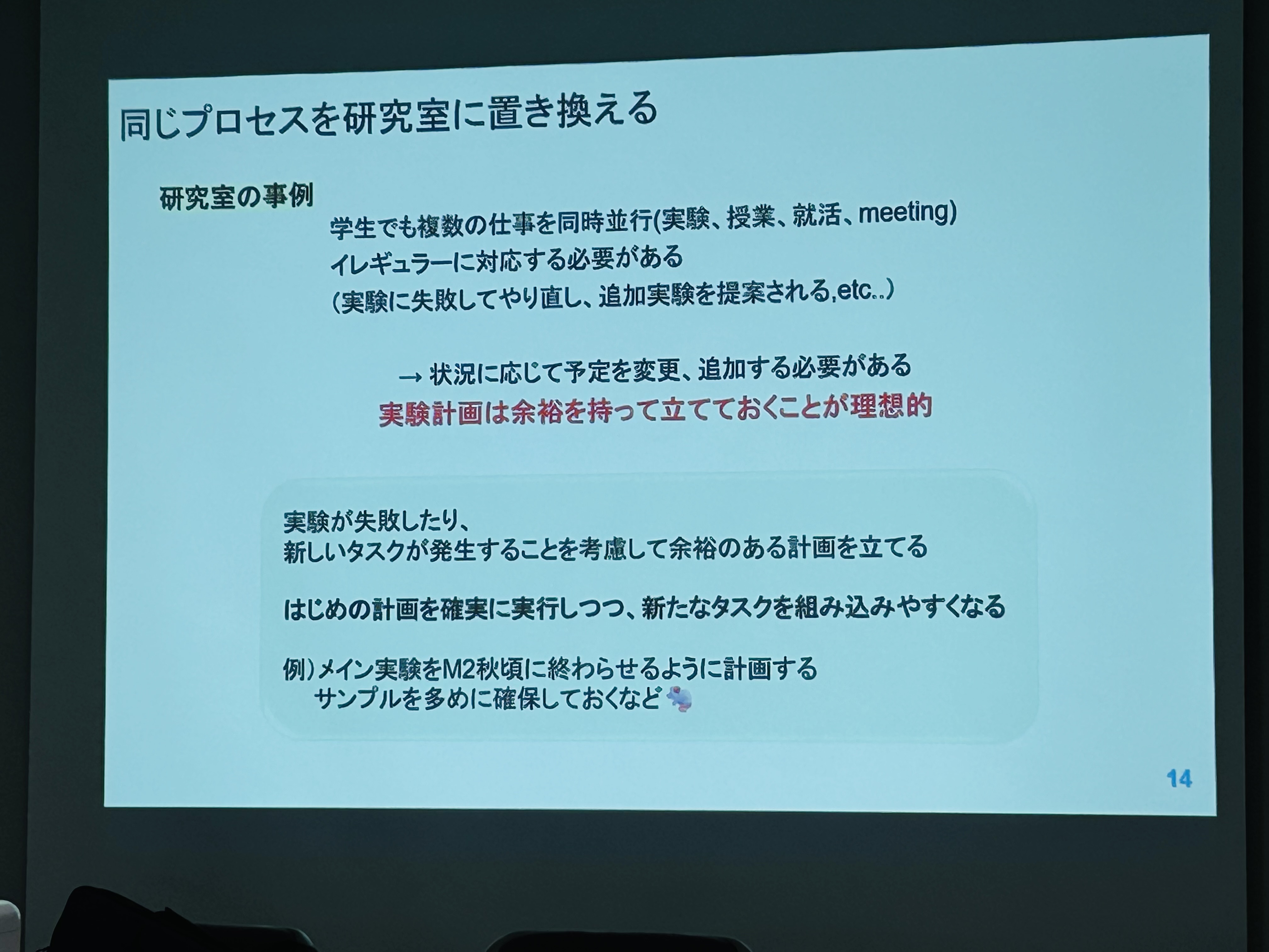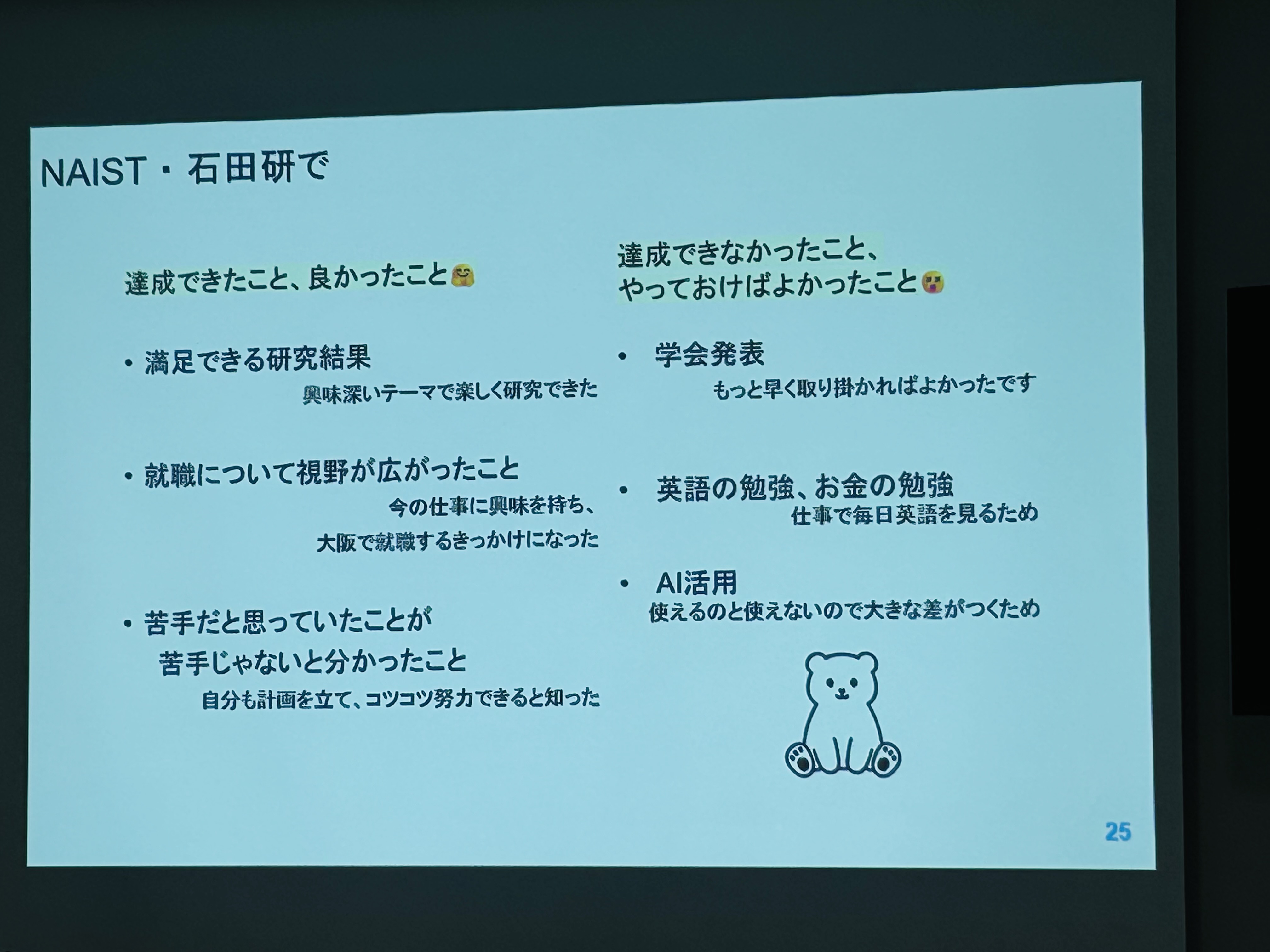「NAISTに来て、石田研に来て、自分が苦手だと思っていたこと、それを実際にやってみると、しっかりと結果を残すことができた!社会に出る前に、この感覚を実感できたことはとても良かったと思います」と光本さんは後輩達に語りかけました。