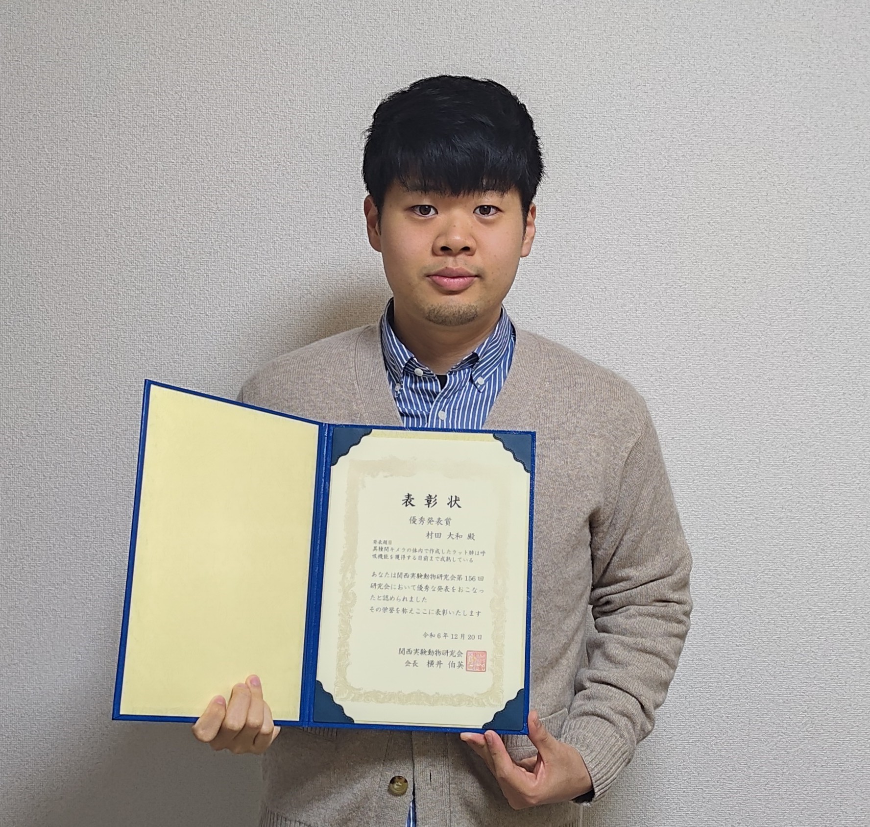 I am deeply honored to have received the Excellent Presentation Award at the 156th Kansai Laboratory Animal Research. I am truly delighted that my daily research efforts have been recognized, and it is a profound joy to receive such a prestigious award for the first time. I would like to express my deepest gratitude to Associate Professor Ayako Isotani for her guidance, as well as to all the members of the Organ Developmental Engineering Laboratory, the staff of the animal facility, university affiliates, and my parents. I will continue to dedicate myself to further advancing my research.