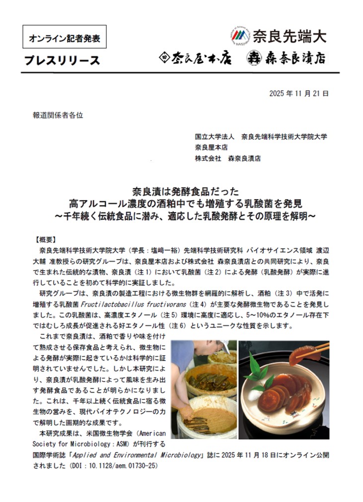 の発酵を支える乳酸菌を発見し、その成果を原著論文として発表いたしました。今回の研究は、奈良屋本店さん、森奈良漬店さんという奈良県内の老舗奈良漬メーカーの皆さまとタッグを組んで進めてきたものです。