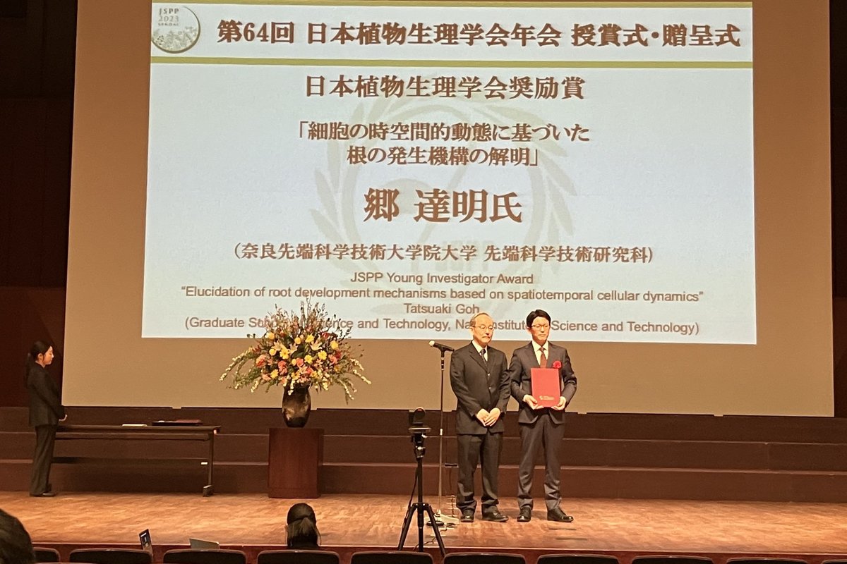BLOG 郷達明助教が日本植物生理学会の奨励賞を受賞 2023年03月16日 日本植物生理学会の年会が東北大学で4年ぶりに対面(ハイブリッド)で開催されました。2日目の授賞式では郷助教が奨励賞を受賞し、受賞講演を行いました。タイトルは「細胞の時空間的動態に基づいた根の発生機構の解明」です。おめでとうございます! 2023 研究 メンバー Back 戻る