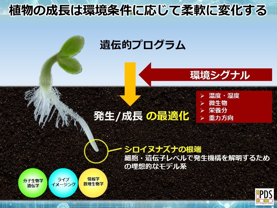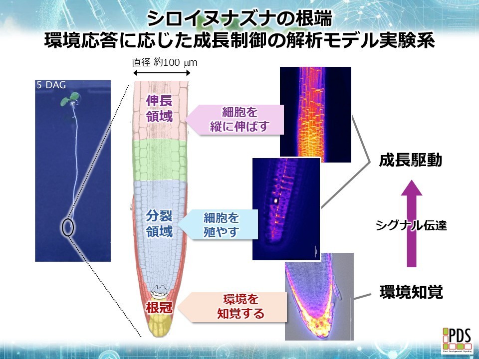 成長する場所を自ら変えることができない植物は、器官の形や成長を柔軟に変化させることで変動する環境に適応しています。植物は動物と異なり知覚や運動に特化した器官や中枢神経を持たないため、環境に応じた成長調節を実現するためには、個々の細胞が環境シグナルを知覚し、個々の細胞が分裂や伸長を変化させながら、全体として統制の取れた変化を動きをする必要があります。このような高度な仕組みがどのように成り立っているのかは、未だ多くの謎に包まれています。