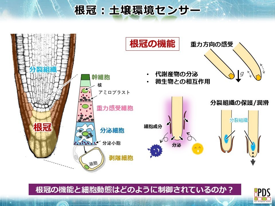 根と土壌環の相互作用には、根冠(Root cap)組織が重要な機能を果たしています。根冠は根端を覆うキャップ状の組織で、重力方向の感受や摩擦の低減、栄養や水分を始めとした土壌環境の受容など、植物の成長に必須の重要な役割を担っています。根冠は伸長する根の先端で様々なストレスに曝されるため、その機能を保持するために構成する細胞を絶えず入れ替える仕組みを備えています。根冠の最内層には一層の幹細胞があり、これが一定の周期で分裂して新しい細胞層を生み出します。これと同じ周期で最も外層の細胞が自律に脱落してゆくことで、組織の大きさと機能を維持しています。
