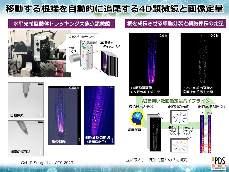 私たちはシロイヌナズナの根端をモデルに用いることで、環境に応じた器官成長のダイナミクスを遺伝子や細胞のレベルで明らかにしようとしています。シロイヌナズナの根は細く透明で顕微鏡観察に適しているため、遺伝子から分子、そして細胞から器官に至る多様なスケールを横断した緻密な解析を行うことが出来ます。一方で、環境知覚や成長制御の中枢である根端部が根の伸長によって速やかに移動してしまうため、高倍率での長時間観察ができないという問題がありました。
