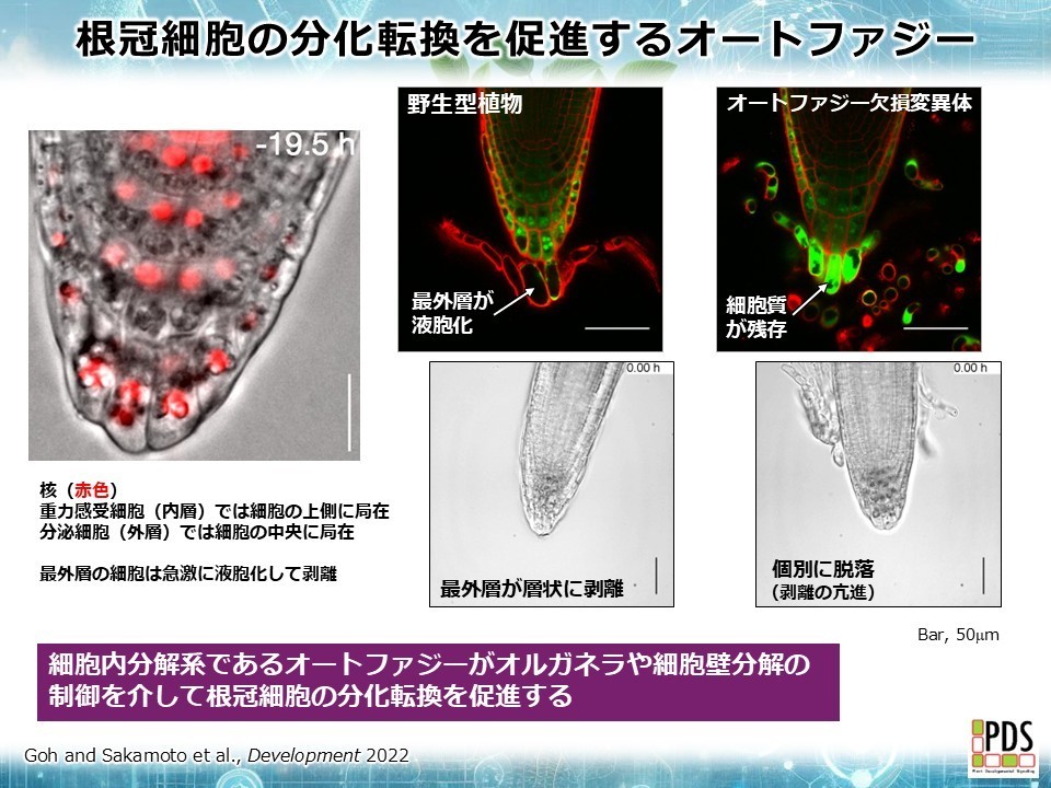 このような細胞の入れ替わりの過程で、個々の細胞の機能が組織内の位置に応じて変化します。内側の細胞は重力感受細胞に分化し、外側に達した細胞は分泌細胞へと変化します。最外層から剥離する細胞は内部に貯まった代謝産物と共に土壌中に分散することで土壌環境を整える働きを担っています。私たちはこの巧妙な分化転換において、真核生物に保存された細胞内消化機構であるオートファジーが重要な役割を果たすことを明らかにしました。この発見は、これまでの謎の多かった植物のオートファジーが通常の発生過程で担う役割を明瞭に示したものです。