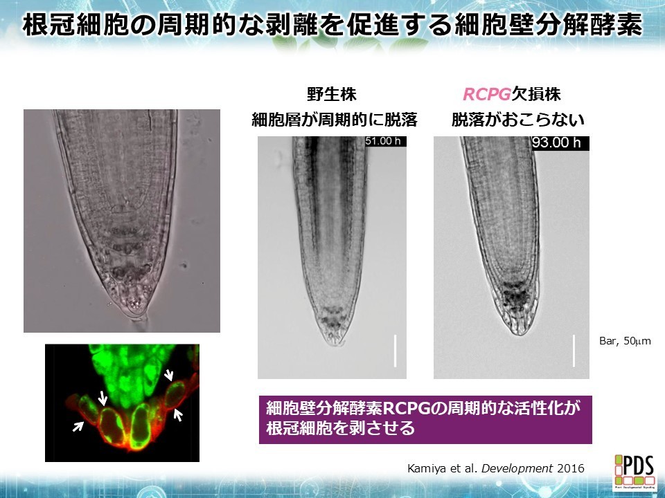 RCPG遺伝子を破壊した変異体では、根冠細胞の脱離が阻害されることを明らにしました。これらの発見は、成長する根の先端で繰り広げられるミクロな細胞動態を明瞭に可視化し、その分子機構を明らかにしたユニークな成果です。