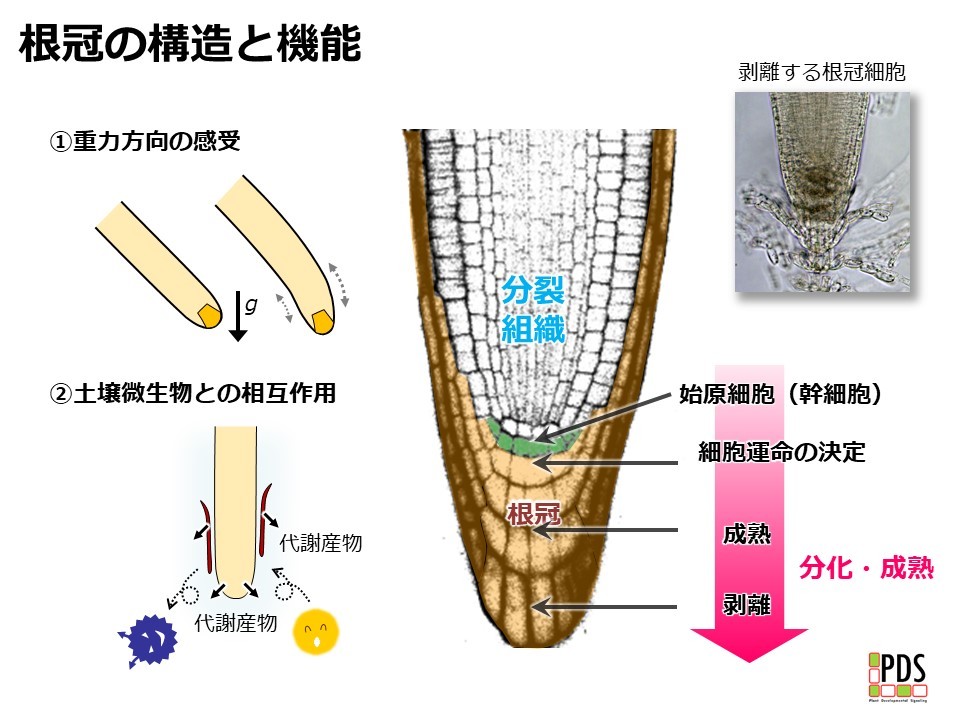 根の先端にある「根冠組織」は、その位置から想像できるように、根の成長制御に非常に重要な機能を果たしています。根の重力センサーとして働くことは良く知られていますが、他にも代謝産物の分泌や、根冠を構成する細胞自体が生きたままが土壌中に分散されることで、根の周りの土壌環境(根圏)に直接的、間接的な働きかけを行っています。