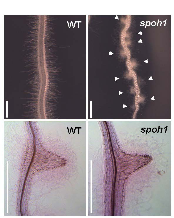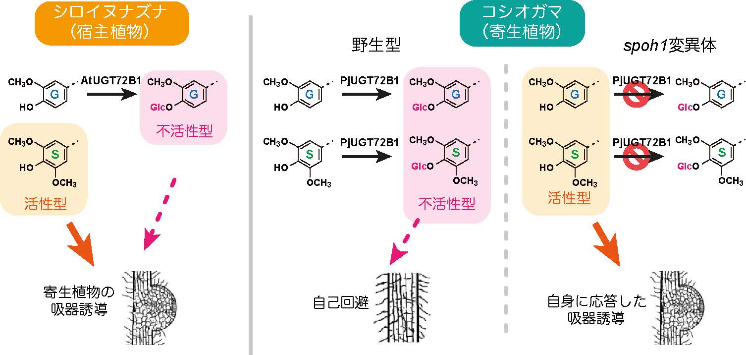 宿主植物のUGT72B1はG型リグニン関連物質を基質とするため、不活性化されなかった吸器誘導物質が分泌される。一方で、寄生植物コシオガマのUGT72B1はG型およびS型の両者にグルコースを転移することで不活化する。spoh1変異体では、不活性化酵素に変異が入るため、自分自身に応答して前駆吸器が形成される。
