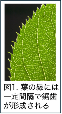 ヒマワリやマツボックリなどのフィボナッチらせん(注3)に代表される植物の周期的な構造は、葉や花などの器官を一定間隔で繰り返し生み出すことで形作られています。また、ひとつひとつの器官の形状に着目すると、葉の縁には鋸歯(きょし)と呼ばれるギザギザ構造が一定の間隔で形成されていることがわかります(図1)。こうした器官や鋸歯等の突起構造は、植物ホルモンであるオーキシンが局所的に蓄積することによって形成されます。オーキシンの輸送体がオーキシン濃度の高い細胞の方へ流す働きがあることで自発的に周期的なパターンが生み出されることが、実験およびコンピュータシミュレーションの結果に基づいて20 年ほど前から提唱されていました1,2,3,4。この説によると、オーキシンの輸送と拡散の関係によって周期性が決まると想定されます。しかし、実際の植物において周期性が変わる観察例はなく、周期性が決まる仕組みは未解明でした。