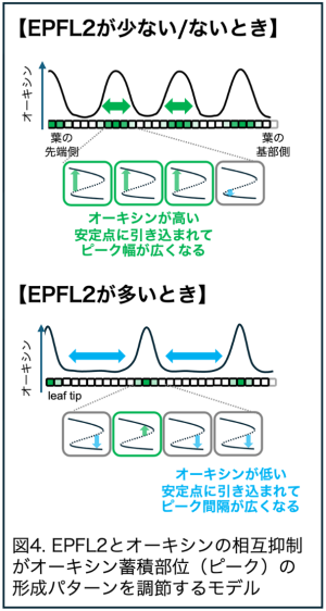 また、EPFL2 が規則的な器官配置パターンの形成に必要であることも見出し、EPFL2 は植物の形作りを一般的に制御する重要な因子であることを証明しました(図3)。こうして、実験とシミュレーションの両面のアプローチに基づき、EPFL2 とオーキシンの相互抑制的関係が繰り返し起こる形態形成イベントの周期性を変調させる仕組みを提案しました(図4)。
