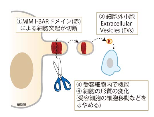 2021 年に末次教授と同研究室の西村准教授らは、I-BAR ドメインを持つタンパク質 MIM が脂質膜の小胞形成を誘導すること、さらに MIM 依存的に形成される突起が切断されて細胞外小胞となり、その小胞を別の細胞に与えると細胞運動が促進されることを発見しました(*1)(図 1)。この際、 Rac1 タンパク質(注 4)が EV を介して運ばれ、受容細胞で機能することを明らかにしていました。
