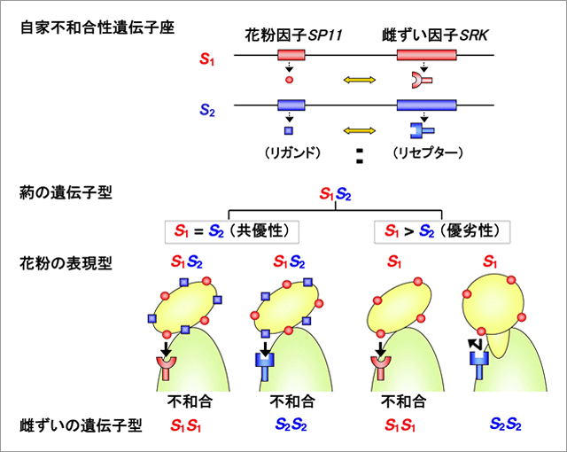 今回我々は、アブラナ科植物の自家不和合性において認められる優劣性現象に着目して研究を行った。自家不和合性は、多くの植物が進化させてきた自殖を抑制するための仕組みであり、自己・非自己の識別は、多数の複対立遺伝子(S1, S2, ---, Sn)により制御されている。アブラナ科植物の場合、各S複対立遺伝子は、実際にはSP11およびSRKという密接に連鎖した2つの複対立遺伝子より構成されることが示されている。SP11は花粉表層のリガンド分子を、SRKは雌ずい側で機能するリセプター分子をコードしている。両分子ともに多型性に富むが、同一S遺伝子上のSP11とSRKが特異的に相互作用することで、自己の花粉の識別が行われ、不和合反応が起きることが明らかにされている(図1)。花粉表層のSP11リガンド分子は、葯(2n)で合成されるため、例えばS1S2というヘテロ体の葯から作られる花粉は、通常はS1とS2の両方の性質を併せ持ち(共優性)、S1またはS2を持つ雌ずいのいずれに対しても不和合性を示す。しかし、SP11複対立遺伝子の間には優劣性の関係が認めらる場合もあり、例えばS1がS2に対して優性の場合には、その花粉はS1のみの性質を示し、S2を持つ雌ずいに対して和合性となるなど、自他識別反応に変化が生じることが知られてきた。