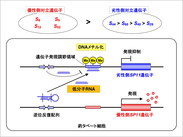 今回、我々はアブラナ科植物Brassica rapaを材料として、S8, S9, S12, S52などの複対立遺伝子が、S29, S40, S44, S60などの複対立遺伝子に対して優性となる仕組みについて解析した。その結果、SP11の発現部位である葯のタペート組織において、優性側のSP11遺伝子の隣接部位に存在する逆位反復配列から24ヌクレオチドからなる低分子RNAが作られること、それが引き金となって相同性を持つ劣性側のSP11遺伝子発現調節領域がメチル化を受け、発現が数万分の1にまで抑制されることが明らかとなった。優性側SP11遺伝子の発現調節領域には合成される低分子RNAと相同な配列がなく、優性側のSP11の発現が抑制されることはない。また、劣性側のSP11遺伝子の隣接部位(の逆位反復配列)からも相同な低分子RNAが合成されるが、それは1塩基置換により標的部位との相同性が低下しており、そのために自己のSP11に対してはメチル化を誘導しないことも明らかとなった(図2)。なお、今回劣性側対立遺伝子としてまとめて扱った対立遺伝子間にも、S44 > S60 > S40 > S29といったさらに複雑な優劣性関係が存在するが、その原因は未解明であり、研究を継続している。